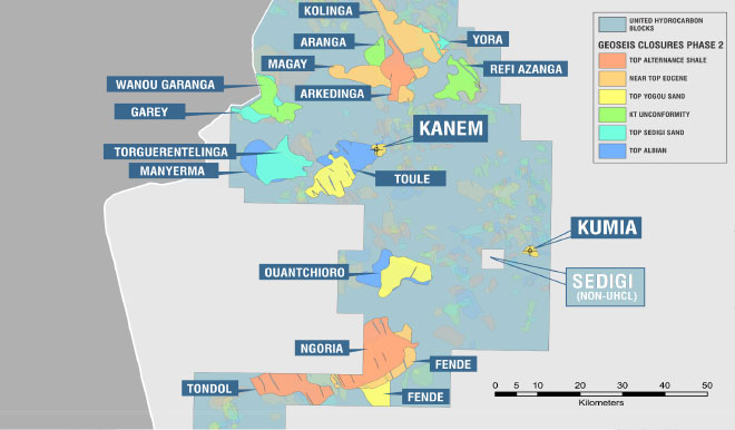 There are three oil discoveries on Block H: Kanem and Kumia, as well as the Seidigi (Non-UHCL) discovery contained within the small, government owned, block inside Block H.
