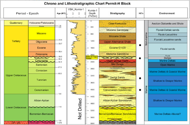 The Kanem discovery showed oil in the Cretaceous and tested oil in the Eocene zone and the Kumia discovery tested oil in the Cretaceous Sedigi Formation.
